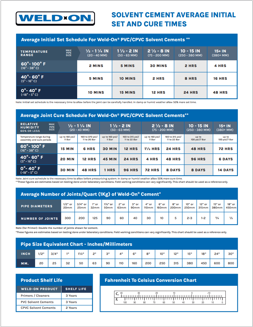Cure time (thời gian đóng rắn hoàn toàn) là khoảng thời gian cần thiết để keo Weld-On đạt độ bền tối đa và sẵn sàng chịu áp lực nước hoặc khí. Sau khi hết thời gian Cure time, các phân tử nhựa trong keo và ống đã hòa tan và kết hợp hoàn toàn, tạo thành một mối nối vĩnh viễn.